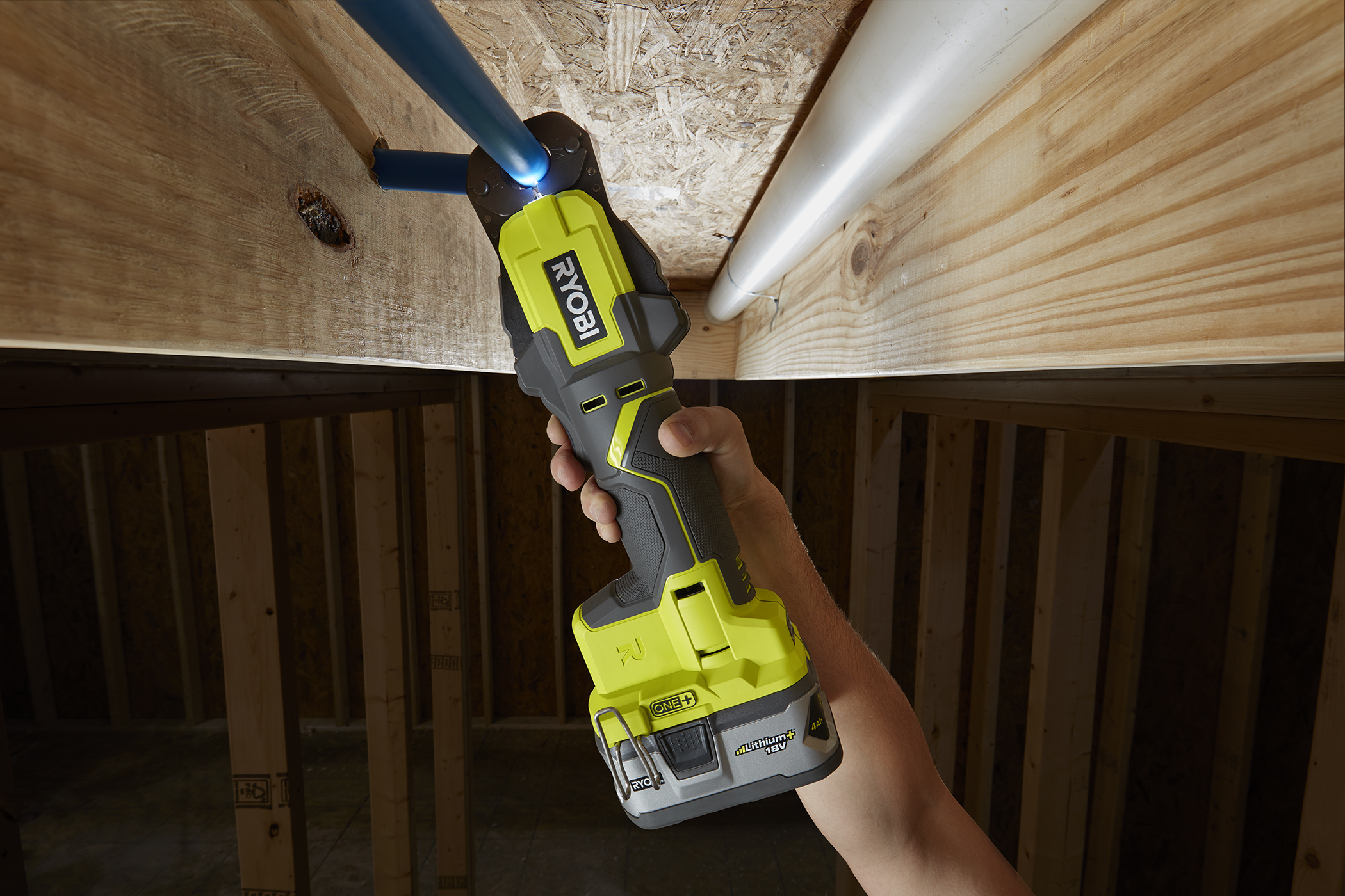 RYOBI introduces the ONE+ PEX Crimp Ring Press Tool. With 320 crimps per charge and an easy one-handed crimping operation the Crimp Ring Press Tool eliminates user fatigue and allows you to get the job done faster. The crimp cycle takes less than 5 seconds with a LED light to indicate completion. The Crimp Ring Press Tool fits all PEX sizes from 3/8", _", ®" and 1". The jaws of the tool fit a 1" ring and die inserts for _" and ®" rings are included (3/8" insert not included) as well as a Go/No Go Gauge to ensure a proper crimp is achieved.