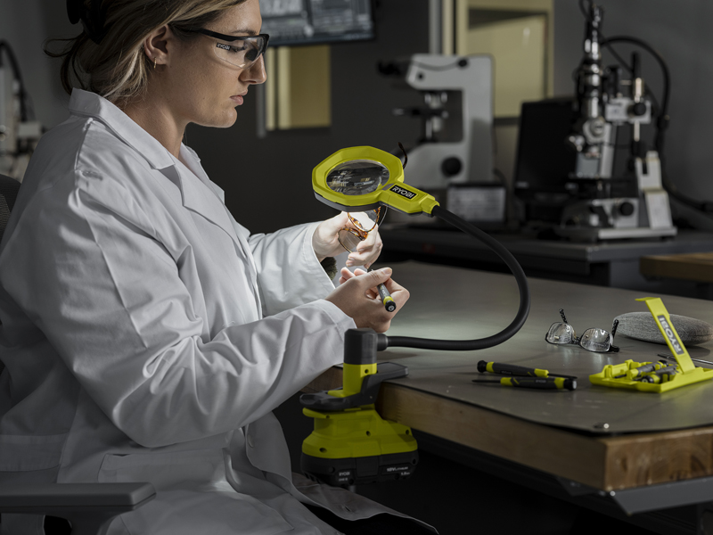 Expand your RYOBI™ 18V ONE+™ system with the RYOBI™ 18V ONE+™ Magnifying LED Clamp Light. With 500 lumens of LED light output and 3.5" wide magnification lens users have the ability to enhance their sight on any project. The RYOBI™ 18V ONE+™ Magnifying LED Clamp Light is ideal for technicians, inspectors, collectors, hobbyists, crafters, readers, and more. Set this product up in nearly any workspace utilizing the convenient clamping base to securely grip both rounded and flat surfaces up to 1-3/4". The high-quality acrylic lens provides distortion-free 2.25X magnification with 5X spot magnification for closer inspections. A 16" flexible neck and rotating base allows for precise placement that is customized to each user's workspace needs. Two brightness settings allow users to select 250 or 500 lumens to match illumination to the task at hand. High-quality LEDs are spaced evenly around the magnifying lens for full workspace illumination. This light allows for all day productivity with over 20 hours of runtime. The RYOBI™ 18V ONE+™ Magnifying LED Clamp Light can be used as either a lighted magnification lens or a standalone LED light. This 18V Magnifying LED Clamp Light is backed by the RYOBI 3-Year Manufacturer's Warranty. Battery and charger sold separately.