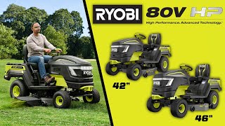 Introducing RYOBI's first lithium-ion battery powered Riding Lawn Tractor, the RYOBI 80V HP 42" Lithium Electric Riding Lawn Tractor. 80V HP Technology combines brushless motors, advanced electronics, and lithium-ion batteries to deliver the power equivalent to a 21 horsepower gas engine*, delivering all the power, without gas, engine maintenance, and significantly less noise. This tractor is powered by 3 brushless motors and 3 80V 10Ah batteries to cut up to 2 acres per charge. When the job is done, the tractor fully recharges in less than 2.5 hours with the included Hyper Charger and on-board charging port. The most versatile Riding Lawn Tractor in the industry features front and rear storage compartments to haul mulch, logs, plants, or any material around the yard. Make quick work of towing, with a capacity of 500 lbs. and a universal 2" square hitch in the front and rear of the Tractor. The Tractor is equipped with a 10-gauge heavy-duty fabricated steel deck and the CROSS CUT multi-blade system that uses 4 steel blades to achieve a superior cut. Remove the deck in under 90 seconds for quick blade maintenance. The full color back lit LCD screen displays runtime, battery level, and charge status while the RYOBI Riding Mower app allows you monitor your charge status from your phone. Mobile Service available in select regions. If your riding mower requires attention, a certified RYOBI support technician can diagnose & service right from your home. Some services may require you to bring your mower to one of the 300+ service centers nationwide. This Tractor is proudly made in the USA with globally sourced materials and has a 5-year limited warranty.